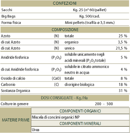 L’Azoto, in forma ureica ed organica, è legato a tettosilicati selezionati che permettono un aumento di scambio cationico, il trattenimento dell’acqua e degli elementi nutritivi. Esso è disponibile sia in tempi brevi (frazione ureica), sia in tempi più lunghi (lenta cessione della frazione organica), in base al bisogno costante e continuo della pianta. Il prodotto è in grado di assorbire una volta e mezzo il suo volume di acqua, per renderla poi disponibile all’apparato radicale della pianta a suo bisogno, creando quindi un ambiente favorevole a limitare il problema di un eventuale stress idrico e/o nutrizionale. Rispetto all’urea tradizionale è più efficiente e più efficace, ostacolando perdite di Azoto per dilavamento e/o sublimazione: si consiglia di usare una quantità per ettaro pari al 70-80% dell’urea tradizionale.