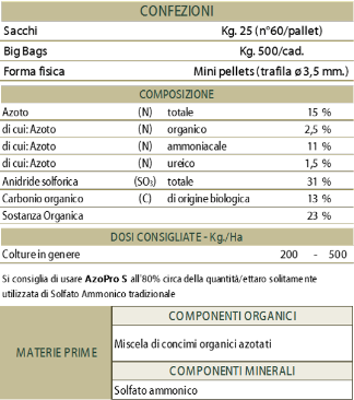 AzoPro S è un’equilibrata miscela delle migliori proteine animali esistenti sul mercato. Indicata per terreni alcalini, punta alla riduzione dell’inquinamento del sottosuolo attraverso l’impiego di un adeguata valorizzazione dell’Azoto fornito per effetto della frazione organica. La quantità ad ettaro consigliata rientra ampiamente nei parametri imposti dalla DIRETTIVA NITRATI, e non trascurare in alcun modo la produzione quali-quantitativa delle colture ed il ritorno economico dell’Impresa Agricola.