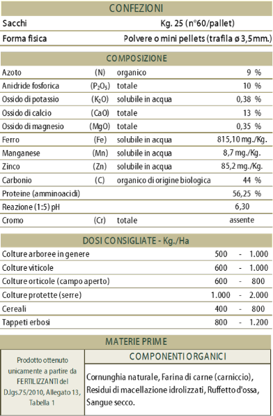 Oltre alle diverse forme di Azoto organico presenti tali da favorirne la disponibilità per tutto il ciclo produttivo, la dotazione di mesoelementi e microelementi lo rende completo per qualsiasi fase di coltivazione e in qualsiasi stagione dell’anno.
