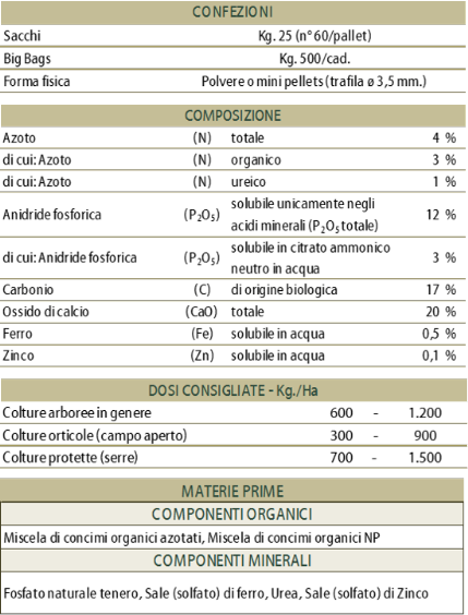 È un concime organo-minerale NP (Ca) con Ferro e Zinco. Composto da diverse
