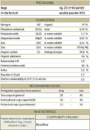 for effect of a specific tecchnique of drying and pulverizaion. Is pefectly assimilable by plants becouse being able to confer their nourishing basics of which they need, strenghtening the health and avoiding the chlorosis. It’s rich of Iron and amino acids