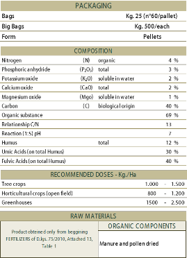Poultry Compost derives exclusively from well-composted and well-dried avian dejections. The composting system used guarantees an odourless finished product, well humified and without ammonia, either as such or with the addition of water with a balanced pH.