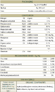 Primo340 is a member of the “Family”, with a high presence of Complete Proteins from organic substance (from which the totality of the Nitrogen is derived) in perfect balance with phosphorus and calcium: due to an excellent quality/price ratio, it's significantly superior to the simple soil improvers and it’s used as an ameliorative alternative to manure or poultry. Sulphur, Magnesium and Zinc complete the product.