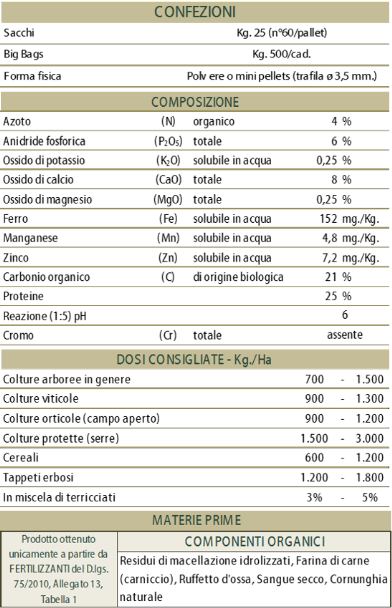Completamente esenti da contaminanti tossici, Azoto, Fosforo e Calcio di origine organica sono resi disponibili immediatamente e progressivamente rispettando la microflora del terreno, permettendo a tali microrganismi utili di svolgere la propria funzione di «digestione organica».